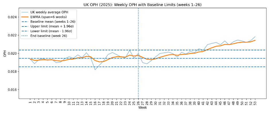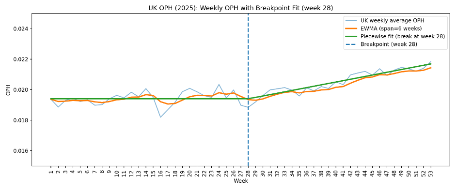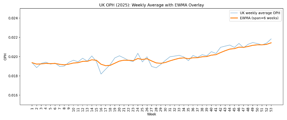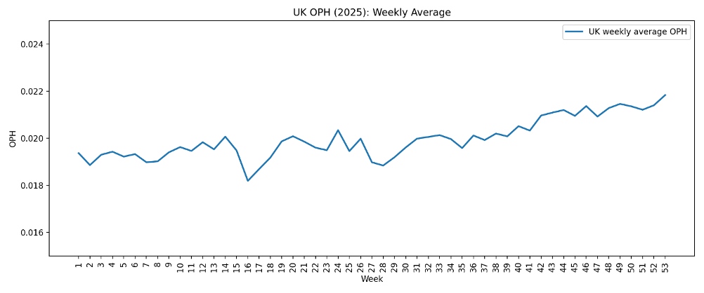 I then worked out the average OPH for each week of 2025.